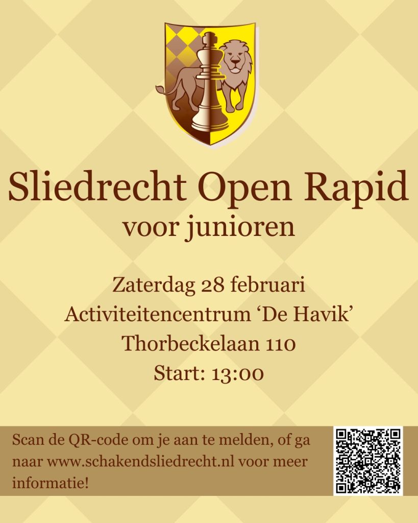 Een schaakvereniging die zichzelf serieus neemt, organiseert periodiek een schaaktoernooi. Op zaterdag 28 februari staat een toernooi voor junioren op de planning: Het Sliedrecht Open Rapid. Iedereen die in het jaar 2007 of later geboren is, kan zich vanaf nu inschrijven!