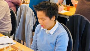 Dana Verheij speelde tegen Henk Boot een zeer scherpe partij, die in het middenspel uitmondde in een materiaalverhouding waarbij Dana een dame moest geven tegen toren plus 2 stukken. Voordelig was ook dat de witte koning van de tegenstander niet veilig stond. Voor Dana was het zaak om alle stukken erbij te halen om het matnet te componeren. Dat lukte prima. Toen bleek dat er voor Henk geen eeuwig schaak inzat, gaf hij op. De stand werd daardoor 3.5-3.5.