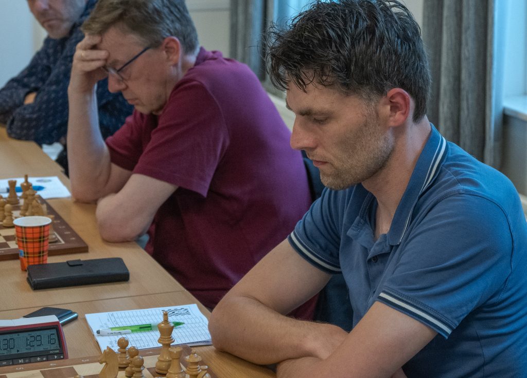 Daarna was Peter van den Bergh klaar op bord 1. Ook zijn tegenstander gooide g4 ertegenaan, maar ook dat leek minder goed getimed. De pion werd aangenomen en de witte aanval kwam nooit echt van de grond. Peter bouwde zijn voordeel uit en veroverde een tweede pion. Maar zijn tegenstander bleef alert, ook met inmiddels minder tijd op de klok, en nam dankbaar een belangrijke pion als cadeautje aan. Daardoor waren er weer wat remisekansen, totdat het cadeau ruimschoots terug werd gegeven in de vorm van een gratis toren. De teamoverwinning was alvast binnen.