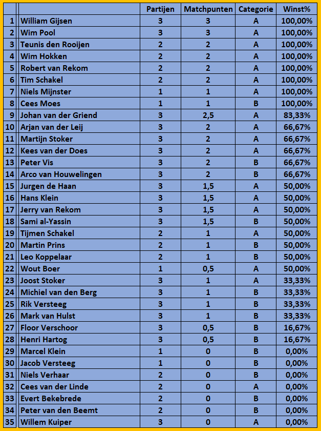 SLIEDRECHT – Op donderdag 23 oktober zijn de eerste partijen voor de Rapid-competitie gespeeld. Met een herfstvakantieopkomst van 35 gingen de klokken op 20+5 en werd er opvallend fel gestreden: veel partijen in rondes 1, 2 en 3 eindigden in wederzijdse tijdnood. Uiteindelijk hielden William Gijsen en Wim Pool de hoofden het koelst en noteerden netjes 3 uit 3. Ook is het goed de Rapid-debutanten te melden: Jacob, Cees en Peter maakten hun eerste meters op de borden.