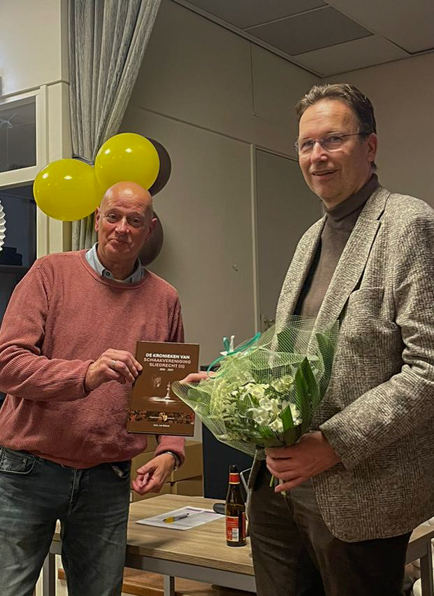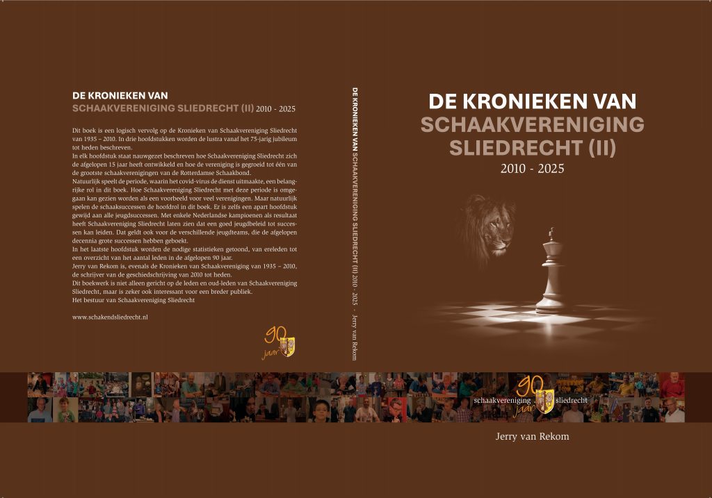 Schrijver Jerry van Rekom presenteerde ’s avonds het jubileumboek “De Kronieken van Schaakvereniging Sliedrecht (II); 2010-2025”. Dit 260 tellende boek beschrijft de geschiedenis van de vereniging van de afgelopen 15 jaar. Ook wordt er een hoofdstuk gewijd aan de jeugdsuccessen die vanaf 1937 zijn geboekt, zowel op individueel als teamniveau. In het hoofdstuk “Statistieken” wordt onder andere beschreven in welke speellocaties de vereniging heeft gespeeld, de ontwikkeling van de contributie in alle jaren en worden de trouwste leden uit de historie opgesomd.