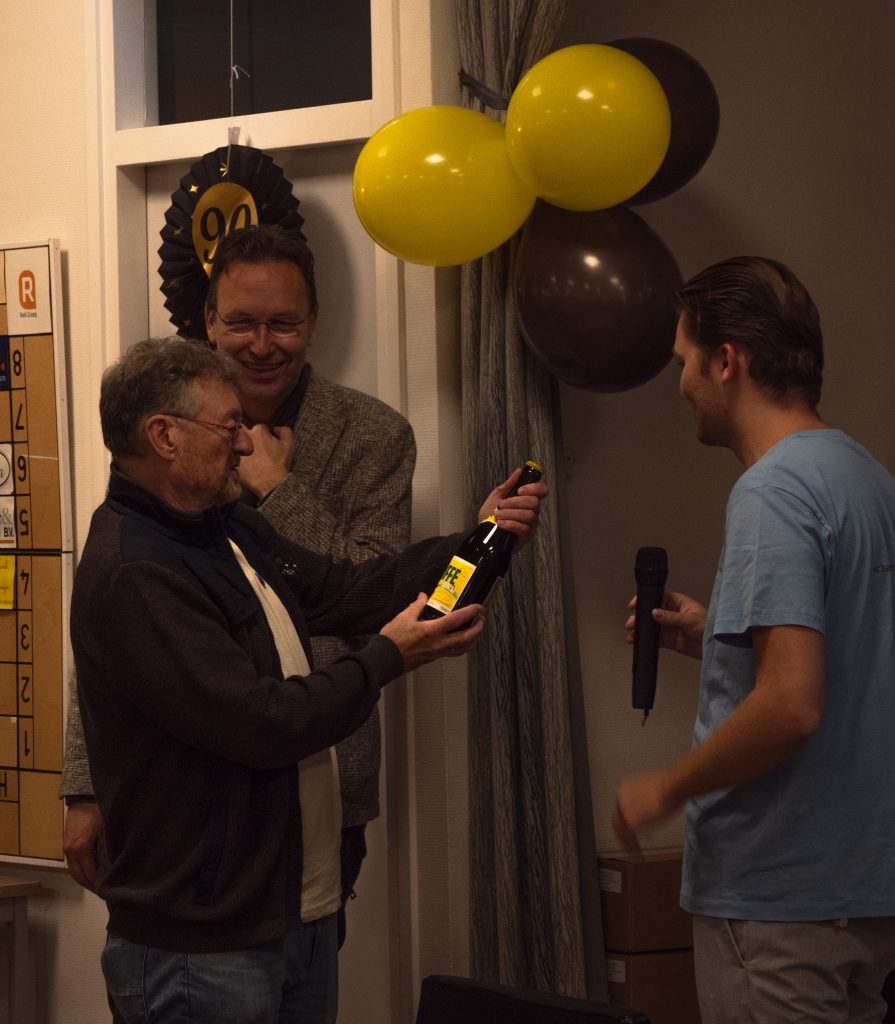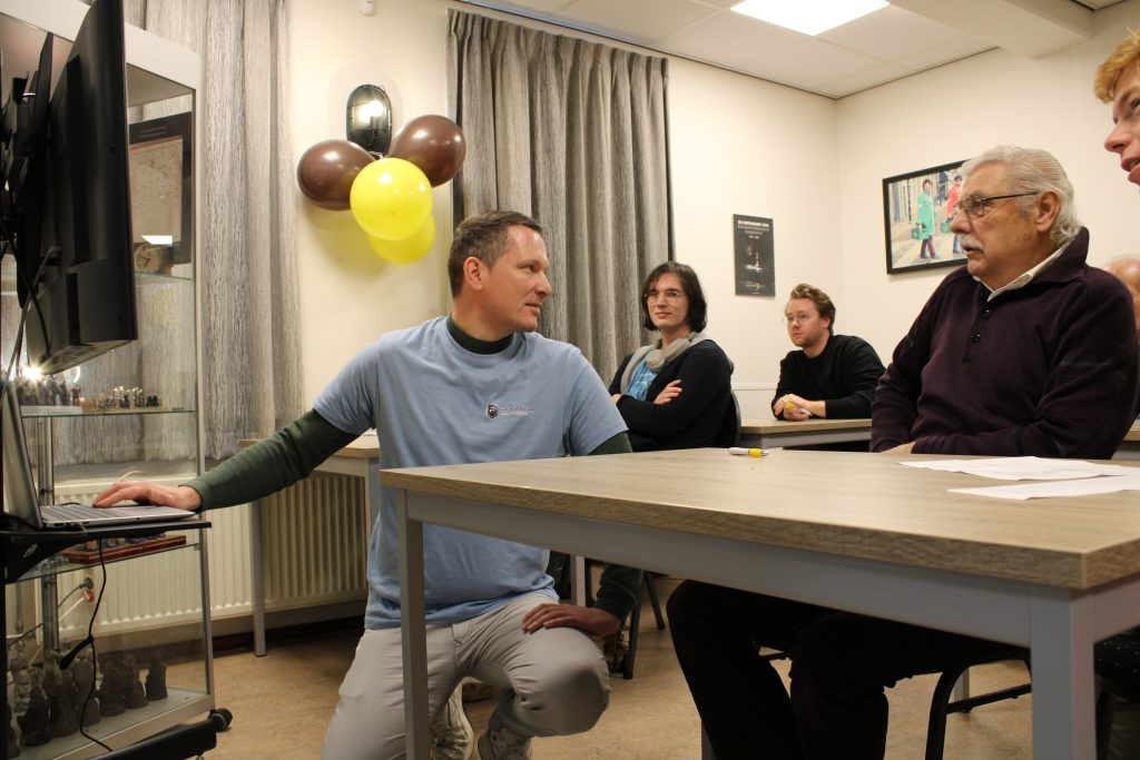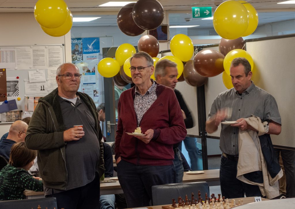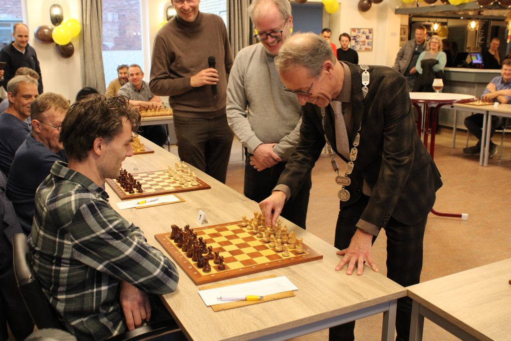 De erevoorzitter reikte het eerste exemplaar uit aan de huidige voorzitter, Marcel Klein. De laatste kan terugkijken op een groot schaakfeest met heel veel leden en schaakvrienden.