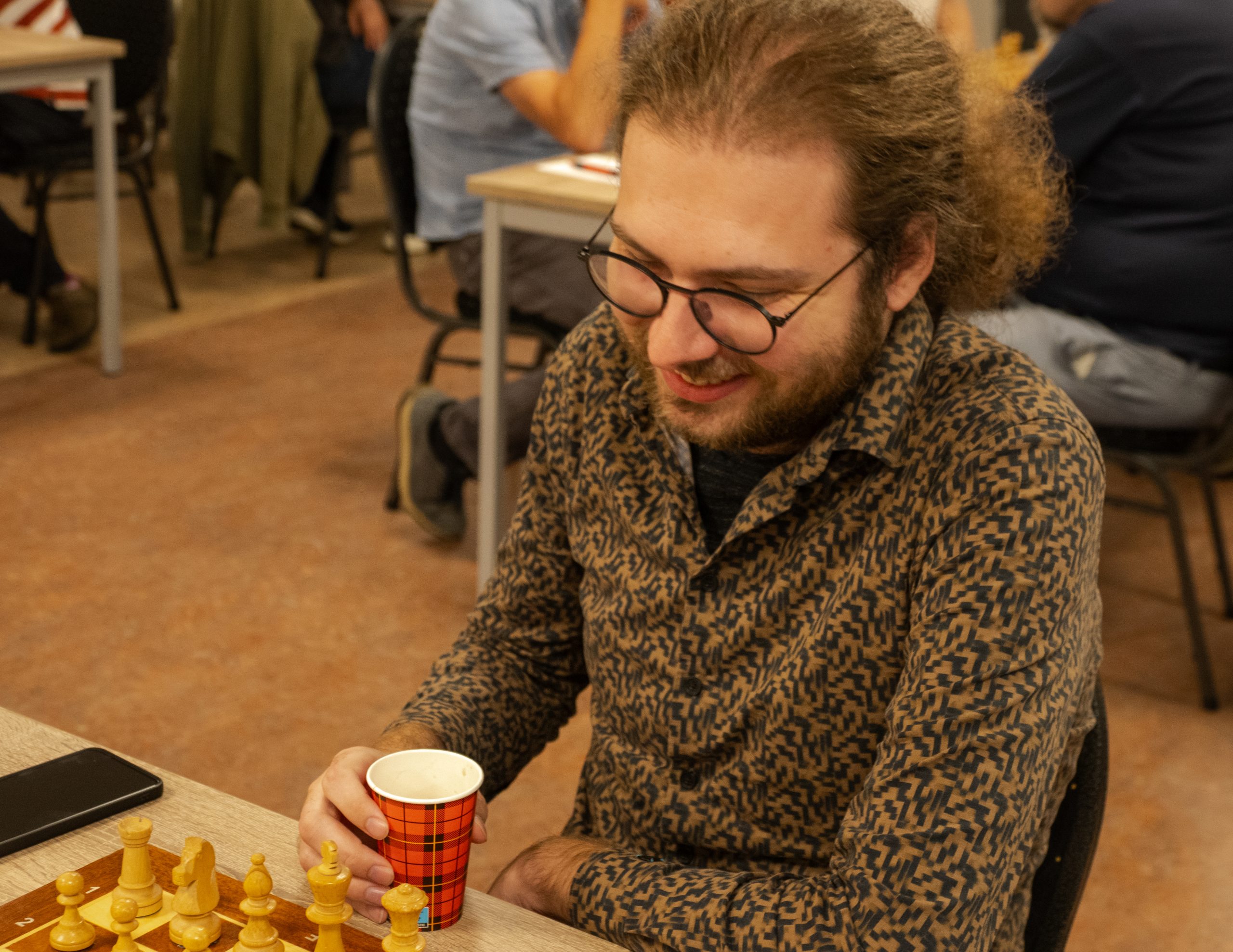 Allereerst de partij tussen Maarten Hartkoren en Arjan van der Leij. Niet vaak duurt een wedstrijd zo lang, zodat uw verslaggever zelfs live de uitslag kon volgen – na een wereldreis vanuit Hellevoetsluis – in plaats van scoreboard journalistiek toe te passen. In de beslissende fase wist Maarten met een pion door te lopen naar een de achterste rij (zie foto), zodat hij een dame mocht bijschrijven. Maar met goed keepwerk van Arjan bleef het nog lang spannend, uiteindelijk wist Maarten toch het verlossende vorkje te ontwijken en het laatste stuk (paard) van Arjan te veroveren en hiermee de partij te winnen.