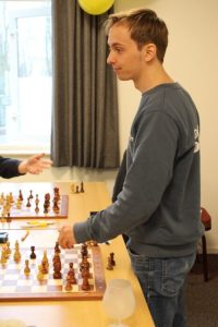 Vervolgens wist Adrian aan bord 2, na het ontvangen remise-aanbod gedecideerd af te wijzen, zichzelf ook langzaam maar zeker in een beter eindspel te wringen. Er gingen wat zwarte pionnen van het bord en de witte stukken werden actiever. Zou het er dan toch nog inzitten? Ja! Adrian weet zijn betere eindspel knap te verzilveren. Het is inmiddels 18:30 en alle gezichten gaan naar bord 5, waar uw verslaggever plaats had genomen.