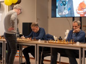 En zo stond het eerste team ineens 1-3 achter. Niet veel later werd het ook 1-4. Kopman Arjan van der Leij trof het niet aan het eerste bord tegen het ratingkanon uit Gouda. Uw verslaggever schijnt hier ook wel eens tegen gespeeld te hebben, maar na jarenlang therapie is hij zijn actieve herinnering hieraan kwijtgeraakt. Arjan deed het in ieder geval veel beter. Dat hij uiteindelijk in een interessant middenspel een pion verloor en net niet genoeg compensatie had, wordt hem uiteraard niet kwalijk genomen.