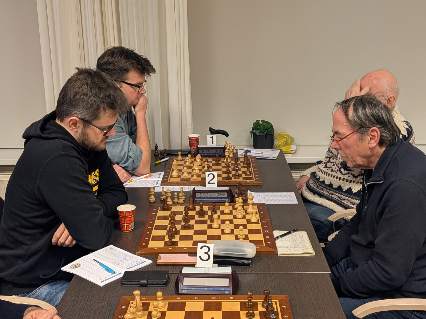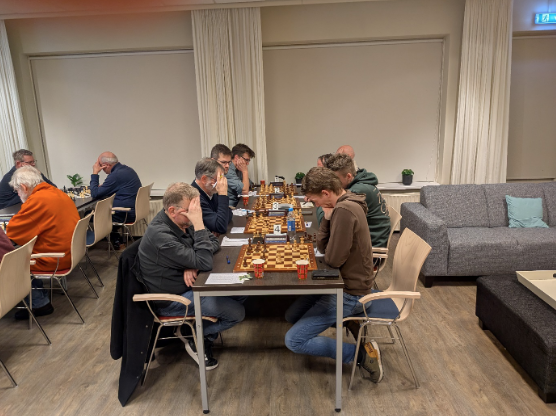 Tot slot nog de partij van uw verslaggever. Arco speelt hier met wit tegen een sympathieke tegenstander. De partij gaat vrij gelijkwaardig op tot Arco een dame weet te positioneren tussen de zwarte stukken. Gevaar dreigt aan alle zijden voor de zwartspeler, maar wit moet dan wel opletten voor de eigen pionnen en stukken. Manoeuvreerwerk ten top. Arco weet deze partij te winnen (na de 1-2 voorsprong bood hij direct remise aan wat – terecht voor het teambelang van de Pionier – werd afgeslagen) en raapt wat stukken op. Uiteindelijk was het zorgvuldig opletten, goed nadenken en de juiste zetten vervolgen om de zwarte dame onschadelijk te maken en de partij te winnen. Discipline met de stukken om die niet te hard vooruit te zetten was hierbij nodig. OKD mag hier echt staan voor: Onberispelijke Kwaliteits-Discipline. Hiermee komt de eindscore op 1-3.