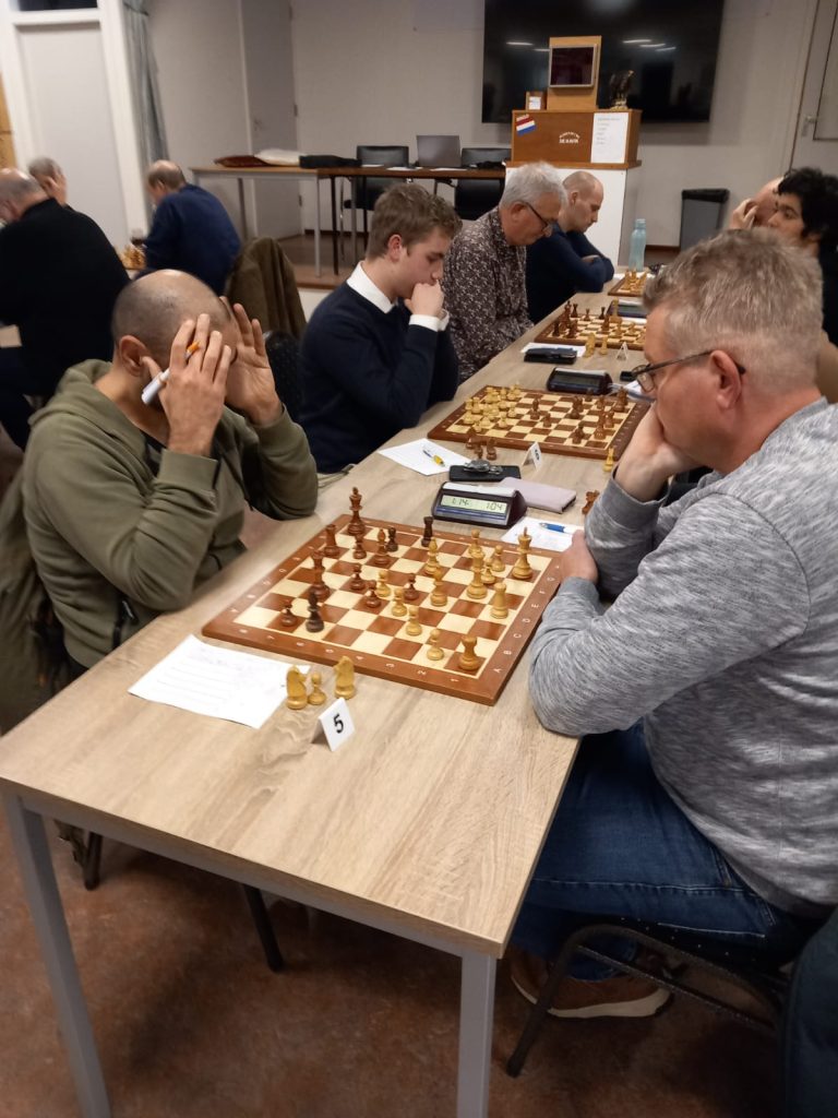 Ferhat Erdogan had aan bord 5 tegen een veel sterkere tegenstander een leuke aanval opgetogen, maar zag de compensatie voor een stukoffer langzaam verdwijnen. Soms voelde het gewonnen, soms voelde het verloren, maar net als de andere partijen nooit remise. Johan Gijsen overwoog remise op bord 7 nog even, maar gezien de stelling had hij weinig te verliezen en veel te winnen. Hij heeft uiteindelijk een verdiend punt gewonnen met wat mooi eindspelwerk.