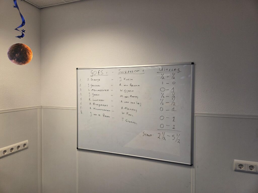 Dan slaat Goes terug en brengen zij de spanning weer in de wedstrijd. Uw verslaggever, Robert van Rekom, had voor de gelegenheid gewisseld van bord met Adrian en mocht op 2 tegen de Goese topper Grochal aantreden. In het middenspel wist ik niet de kritieke varianten op het bord te krijgen, waardoor mijn tegenstander steeds iets beter kwam te staan. Hij kon afwikkelen naar een erg goed eindspel, of een gewonnen eindspel, en koos voor het eerste. Even had ik hoop op een niet verdiende ontsnapping, maar wit speelde het gewoon sterker en won vrij probleemloos. Een langzame dramafilm met een vooraf te verwachten afloop dus.