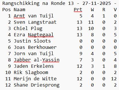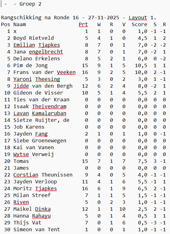 De strijd om de clubkampioenschappen wordt bij de jeugd gestreden in 2 groepen. Groep 1 voor de gevorderde jeugd (speeltempo 10+5), Groep 2 voor de starters en lerenden (speeltempo 10+0). De eindstanden per 13 oktober 2025: