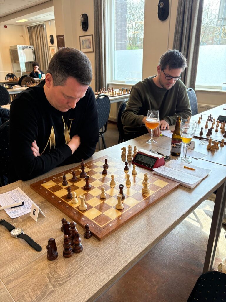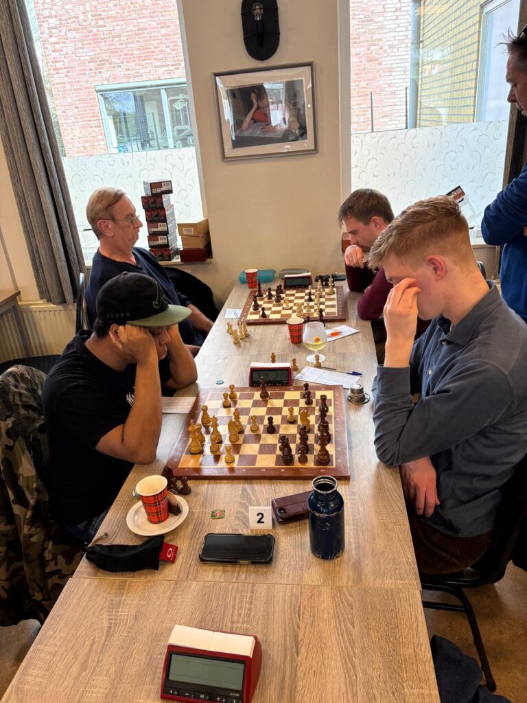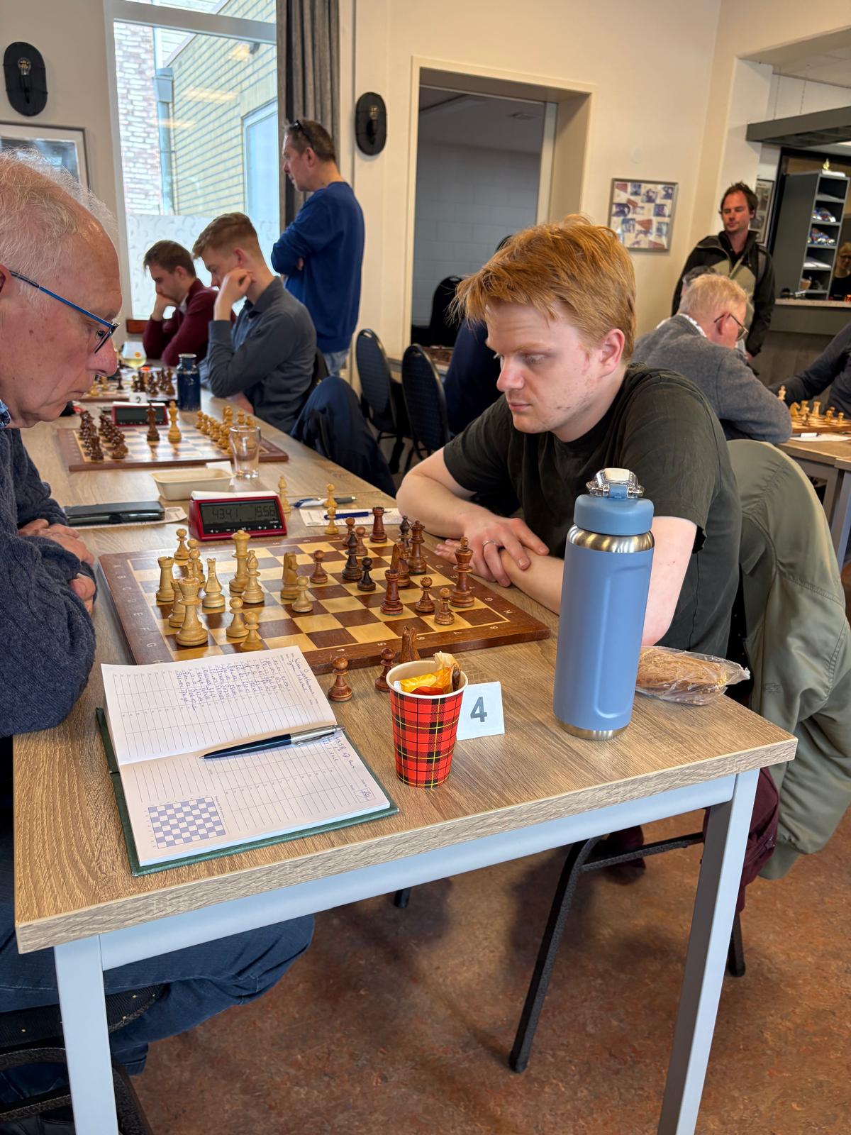 Gezien de geschiedenis van Sliedrecht 3 dit seizoen was dat geen onlogisch scenario. Maar gelukkig scheurde Jeroen niet door Rotterdam, maar kwam hij uiteindelijk gewoon de Havik binnen rijden — precies op tijd om zijn befaamde tijdnoodstrategie uit te rollen. Want zodra hij achter het bord zat, was alles weer zoals het hoort: rustige zetten, koelbloedige blik, en intussen de klok van zijn tegenstander in de gaten houden. Tijdens de partij werden beide spelers erg zelfs slaperig van.